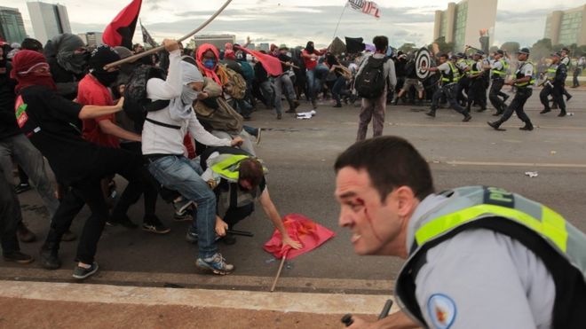 In Brasilia, masked protesters set fire to a bus and marched on the local offices of Globo TV, which they say is biased towards Mr Temer's government. But the marchers were blocked by riot police.